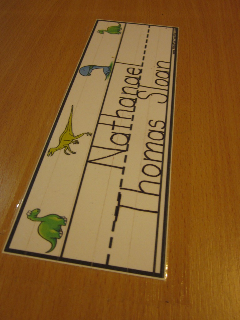 (Below) Nate's nametag on his desk. During the day this nametag is nowhere to be found underneath his pile of papers and books. We have jokingly nicknamed the kid "pig-pen" after the Peanuts character with the dust all around him. [And he's a good sport about it, too, joking back with us.] When Nate loses something, it is usually pretty easy to find... Just have to start moving things around!